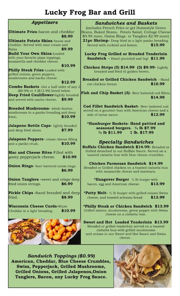 The menu at The Lucky Frog Bar and Grill satisfies all appetites, featuring a diverse selection of dishes. From the appetizers like Wisconsin cheese curds and jalapeño poppers to the main courses, there's something for every palate. Highlights include the crispy wings available in an array of sauces and the famous tenderloin sandwiches.