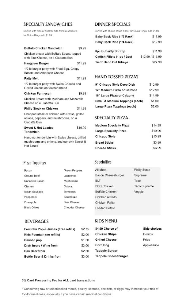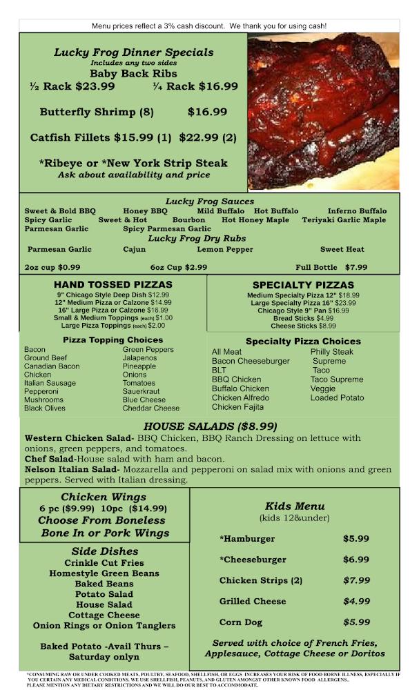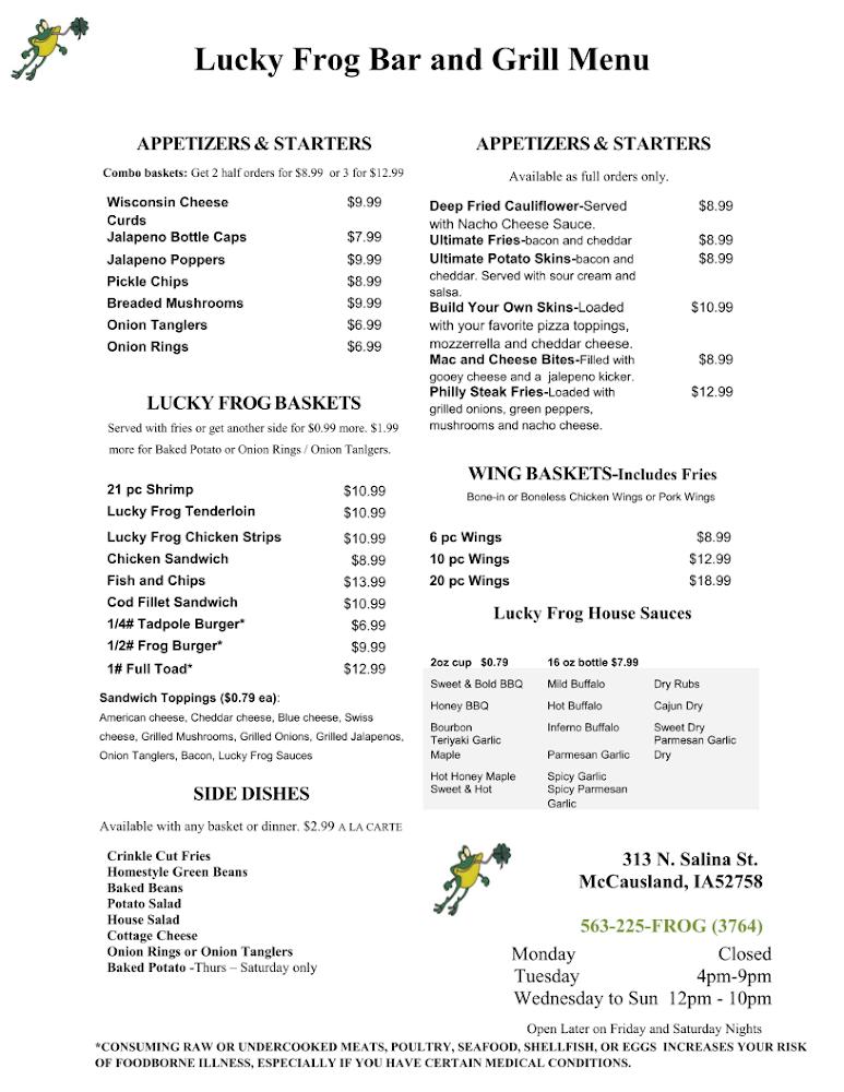Welcome to The Lucky Frog Bar and Grill, your go-to destination in McCausland for delicious food and warm hospitality! Indulge in our made-to-order dishes crafted with fresh ingredients, featuring daily lunch and dinner specials. Savor our handmade pizzas and award-winning baby back ribs, or choose from over 15 unique wing sauces to elevate your meal. Enjoy a lively atmosphere with karaoke, live music, and a great selection of cocktails and local beers. Whether dining solo or with friends, our cozy spot promises quick service and accessibility for everyone. Experience the charm of The Lucky Frog today!